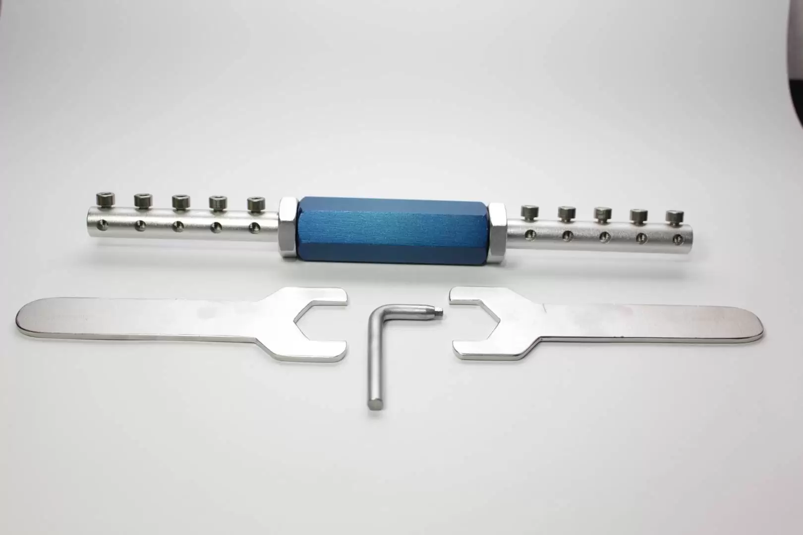 01 Corpo com rosca M14x1,5 direita red. 14,3 x 137 mm, 01 corpo com rosca M14 x 1,5 esquerda com red. 14,3 x 182mm, ambos com 05 furos cada, para colocação de pinos red. 5,0mm. Estes corpos encaixam em um corpo de alumínio sextavado de 25,4 x 80mm, sendo travado por duas porcas M14x1,5 (direita e esquerda).